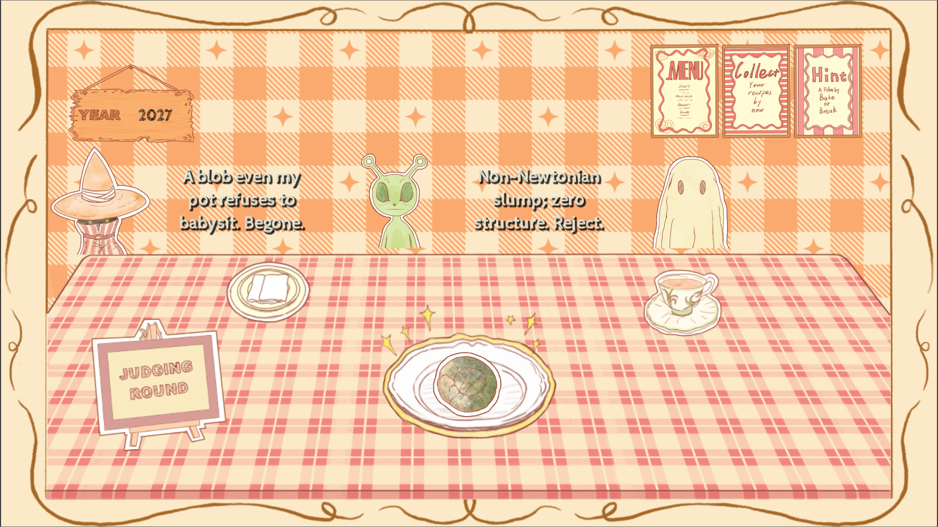 Welcome to the Annual Baker’s Trial, where mortals gather to compete for the legendary Baker’s Flame bestowed by the God of Biscuits. To win, you must please three unusual judges—creatures of mystery, mischief, and very particular tastes.